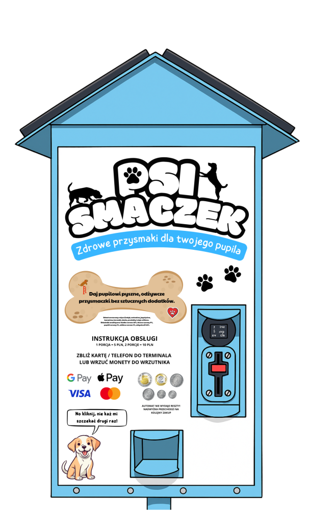 Psi Smaczek — dumnie polska firma z wielkimi ambicjami! Marzymy, by każdy właściciel psa w Polsce miał zawsze pod ręką automat z pysznym smaczkiem i rolką woreczków — 24 godziny na dobę, 7 dni w tygodniu.